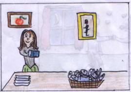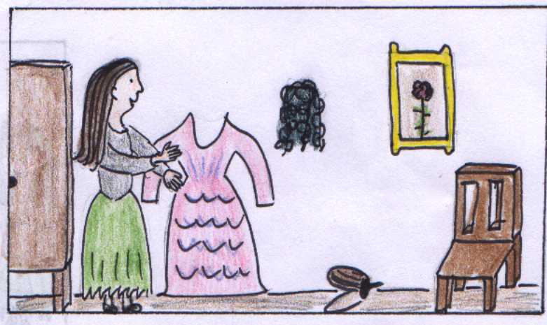 Když Popelka pomáhala sestrám s přípravami, říkala si, jak ráda by šla s nimi, ale nemohla. Když odjely a Popelka měla vše hotovo, rozevřel se jeden oříšek a z něj Popelka vyndala krásné plesové šaty a mohla jít na ples.