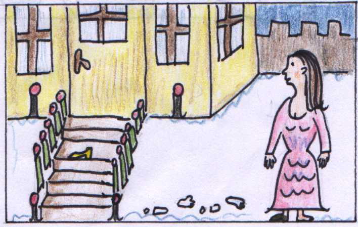 To se opakovalo ještě 2x. Poslední noc však nechal princ natřít schody lepem. Když Popelka odcházela, přilepil se jí jeden střevíček ke schodu. Ale co se dalo dělat, musela domů.